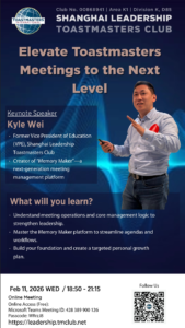 Join us for an exclusive session with Kyle Wei, the mastermind behind the “Memory Maker” platform. Learn the “inside-out” secrets of how Shanghai Leadership Toastmasters Club maintains its gold standard for meeting excellence.
