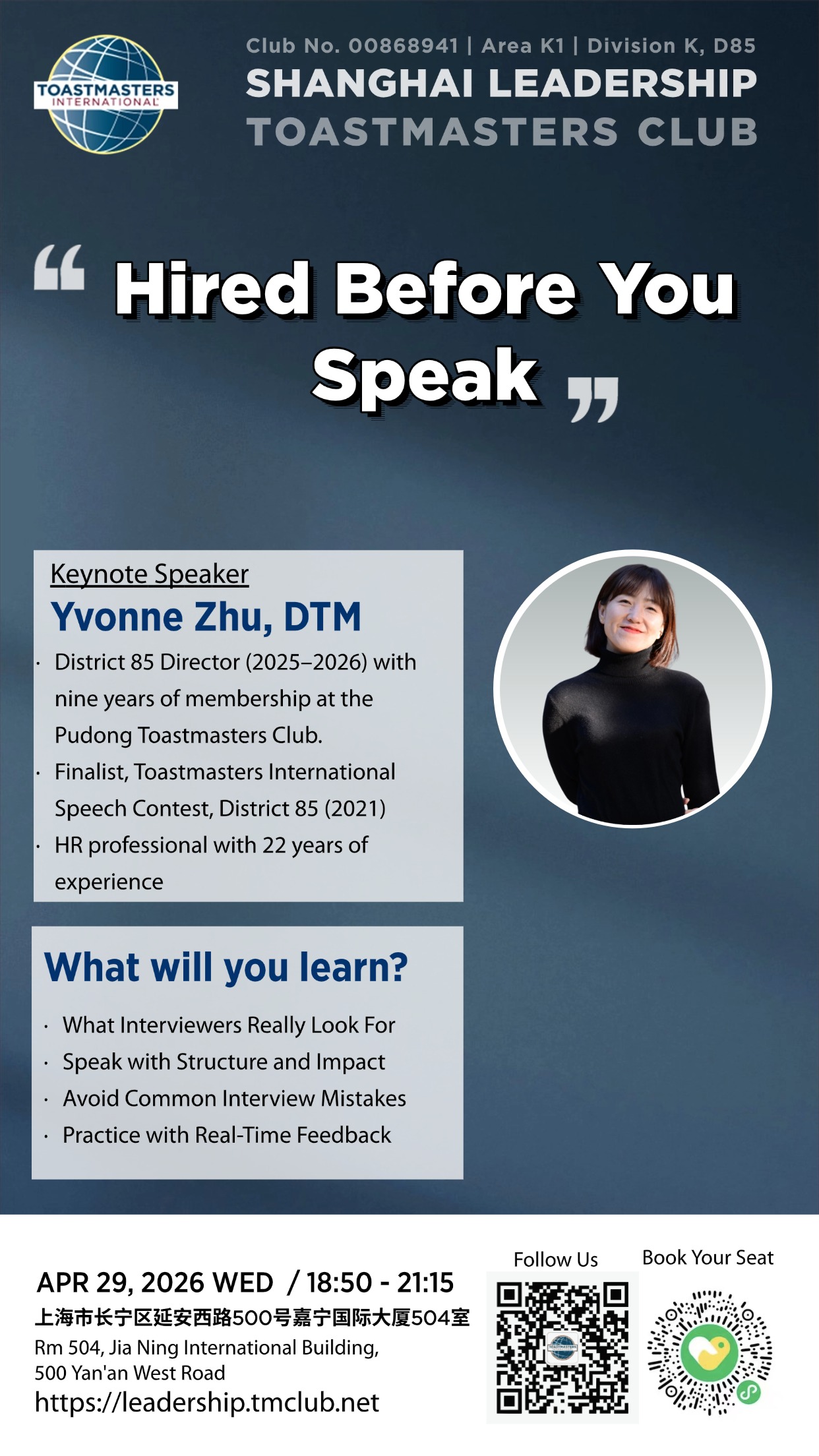 oin us for an evening of high-impact insights with Yvonne Zhu, our District 85 Director and a seasoned HR veteran. With over two decades of human resources expertise and a track record as a District International Speech finalist, Yvonne knows exactly how to blend the art of public speaking with the science of getting hired.