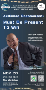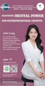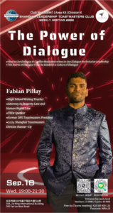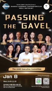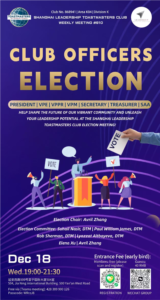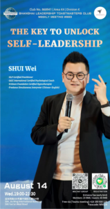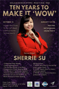 At Shanghai Leadership Toastmasters Club we are lucky to have amazingly artistic and creative people take on the VPPR (Vice President of Public Relations) officer role. Our VPPRs design and publish captivating meeting posters to promote every meeting.